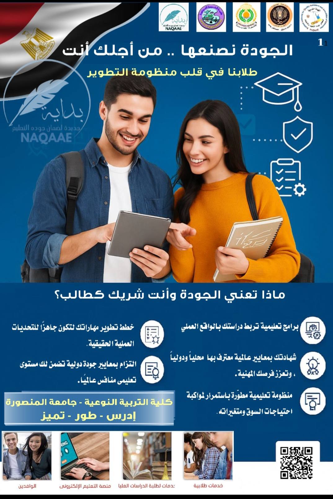 في إطار حرص كلية التربية النوعية جامعة المنصورة على المشاركة الفعالة في المبادرات الوطنية والجامعية للارتقاء بجودة التعليم وتعزيز ثقافة الاعتماد، شاركت الكلية في فعاليات مبادرة "بداية جديدة لضمان جودة التعليم"، التي أطلقتها الجامعة بحضور معالي الأستاذالدكتور/ شريف يوسف خاطر – رئيس الجامعة، و معالي الأستاذ الدكتور/ علاء عشماوي – رئيس الهيئة القومية لضمان جودة التعليم والاعتماد، إلى جانب السادة نواب رئيس الجامعة، وقيادات الهيئة القومية،أ.د/ محى الدين اسماعيل العلامى - عميد الكلية ، وعمداء الكليات، وأعضاء هيئة التدريس، وممثلي الإعلام والصحافة.